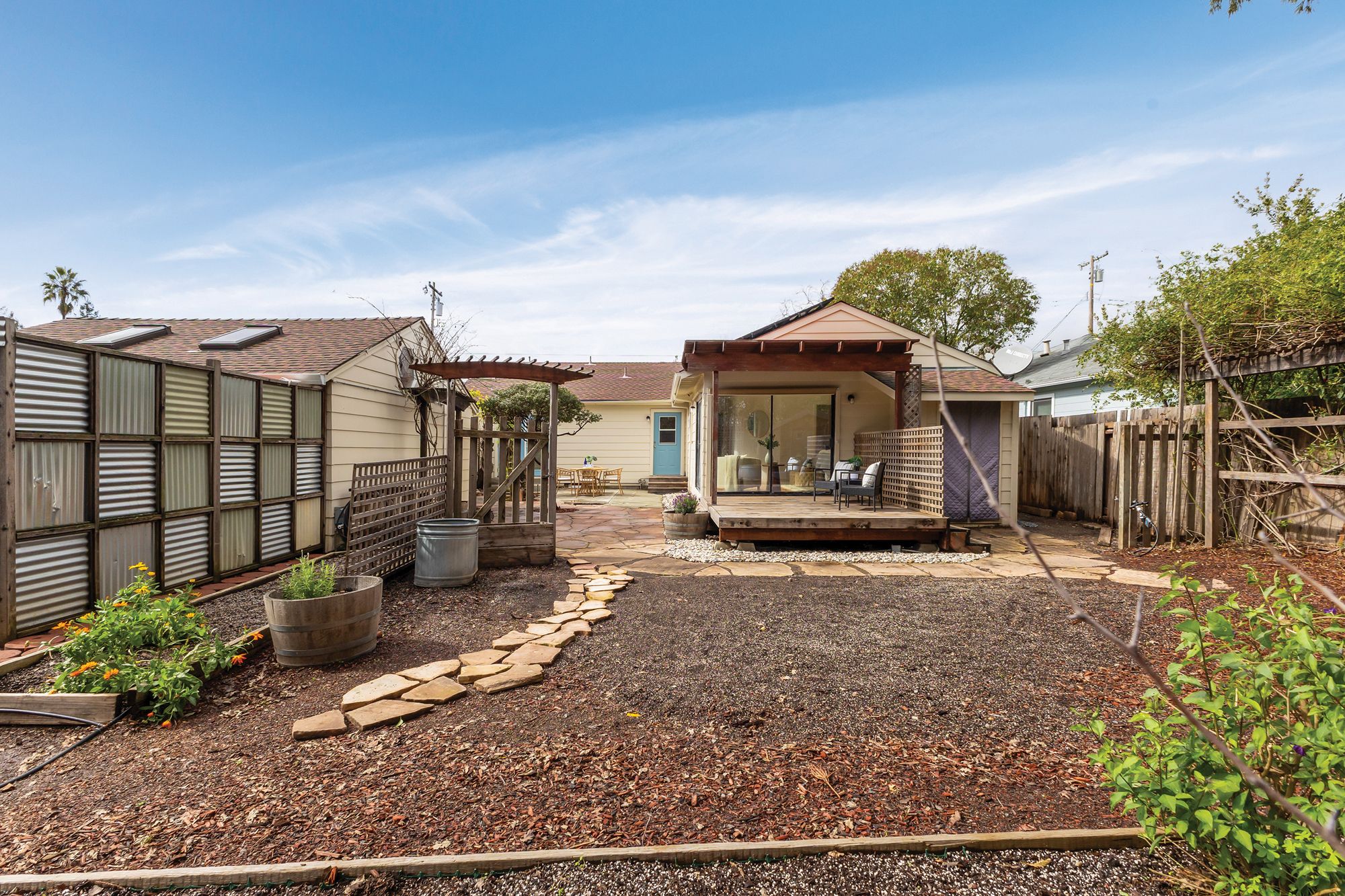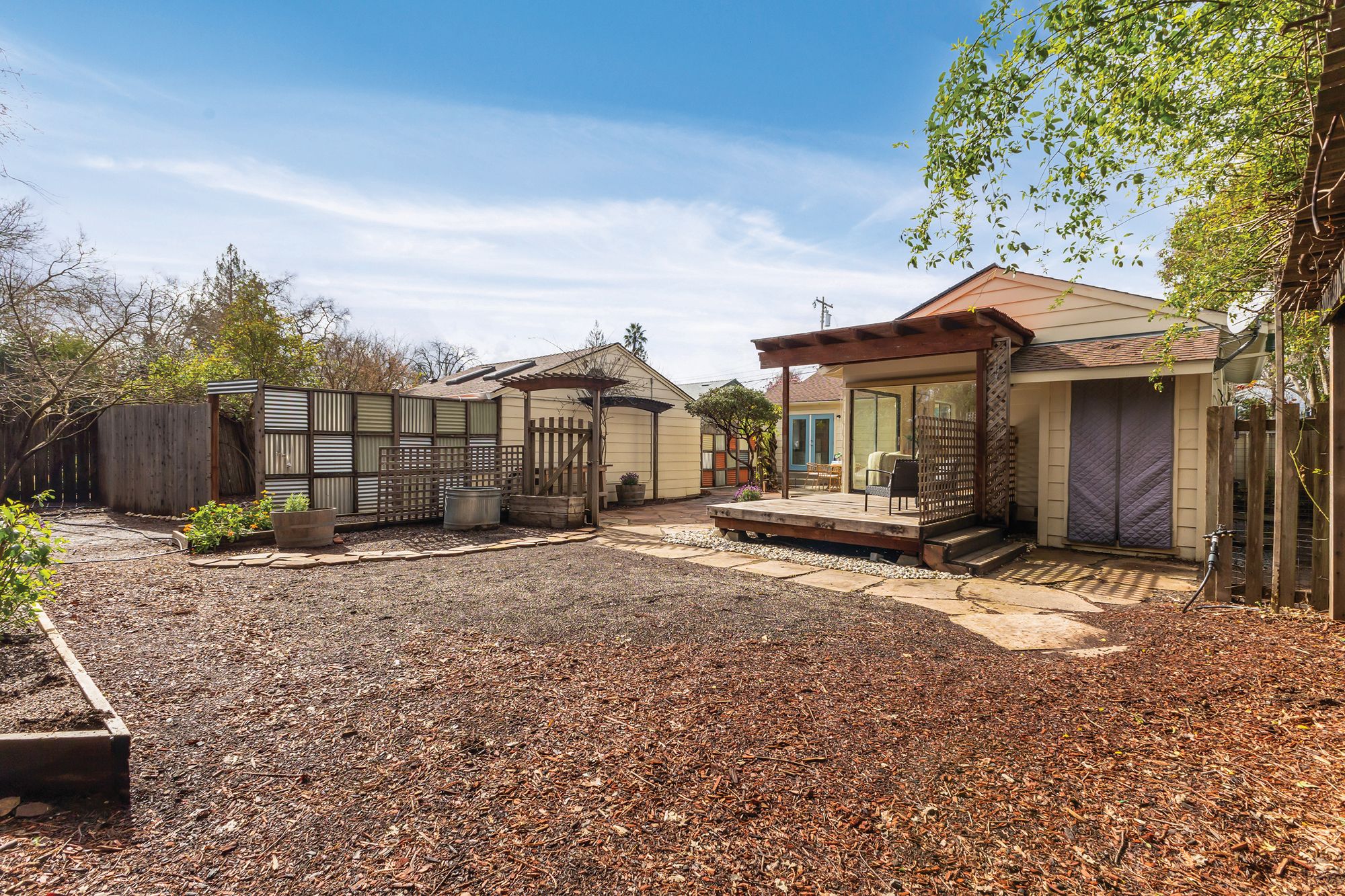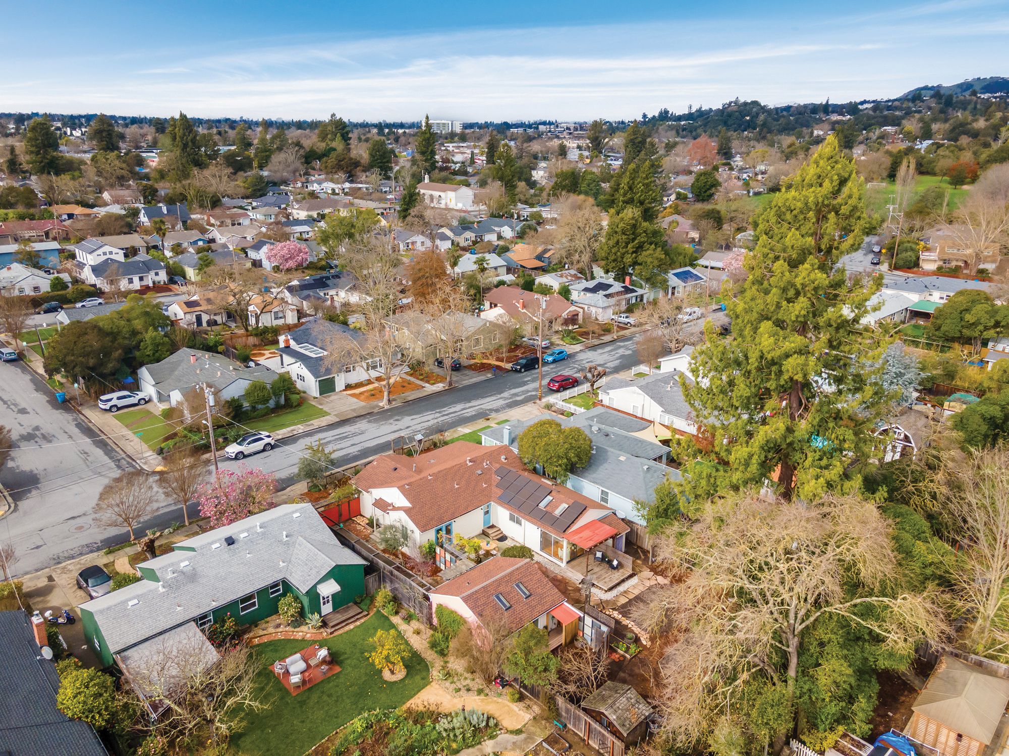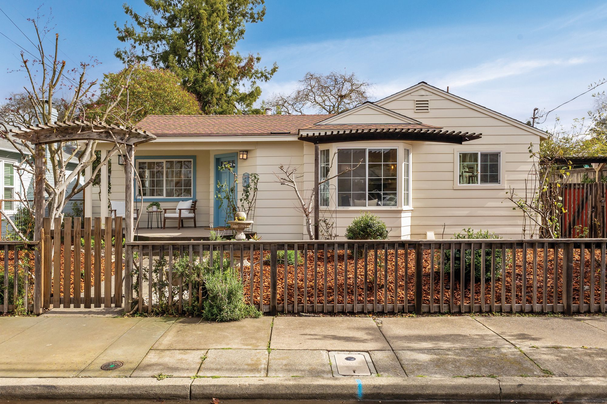 Welcome to the coveted J.C. neighborhood, where tree-lined streets, classic architecture, and a strong sense of community create one of Santa Rosa's most beloved settings. This charming single-story 3 bedroom, 2 bathroom home offers approximately 1,658+/- sqft of thoughtfully updated living space that blends timeless 1940s character with modern comfort. Inside, natural light fills the home, highlighting original hardwood floors, fresh interior paint, and inviting spaces designed for both everyday living and effortless entertaining. The updated kitchen features quartz countertops, a spacious pantry, and easy flow into the main living areas perfect for gathering with friends or enjoying quiet mornings at home. Owned solar enhances energy efficiency and long-term savings. The primary suite addition offers a peaceful retreat, complete with vaulted ceilings, skylights, a walk-in closet, and direct access to the expansive backyard. Whether hosting summer dinners, gardening, or simply unwinding outdoors, the generous yard provides endless possibilities for enjoying Sonoma County's indoor-outdoor lifestyle. Adding exceptional versatility, the detached permitted ADU (400+/- sqft) has its own address, private gated entrance, and fenced yard. Ideal for guests, extended family, creative workspace, or income potential, it includes a full kitchen, full bath, walk-in closet, separate washer and dryer hookups, and efficient heating and cooling. Located just moments from downtown Santa Rosa, neighborhood parks, local dining, and shopping, this special property offers the rare combination of historic charm, modern flexibility, and an unbeatable location in one of the city's most desirable neighborhoods.