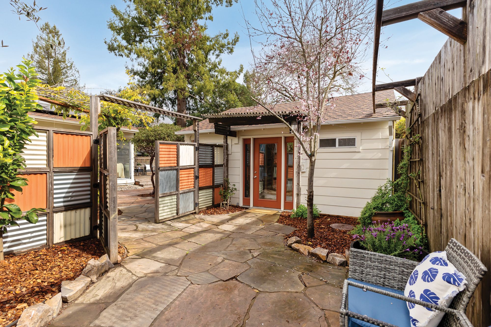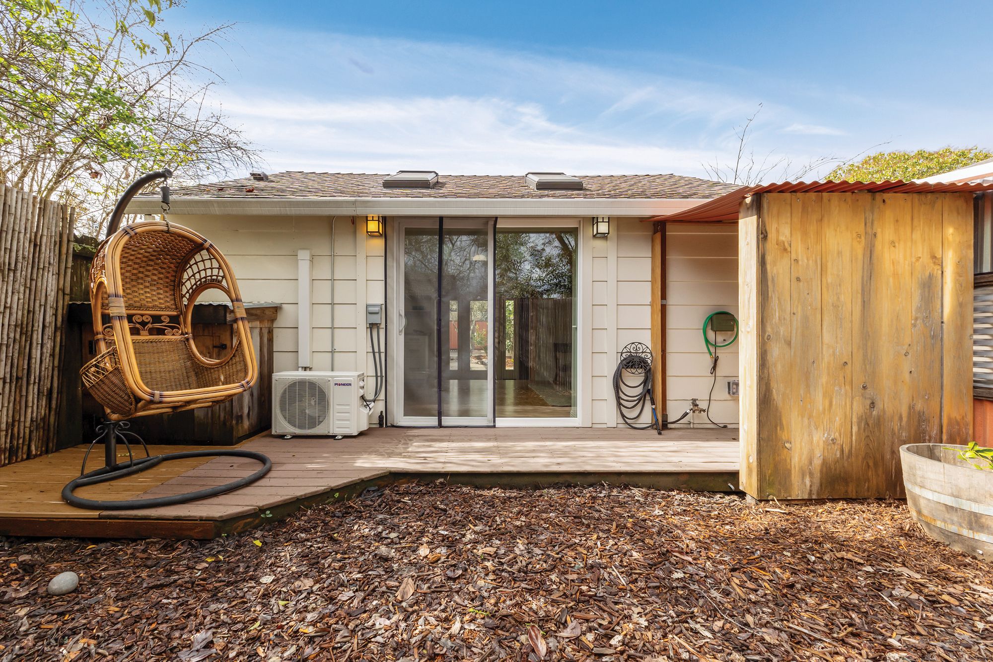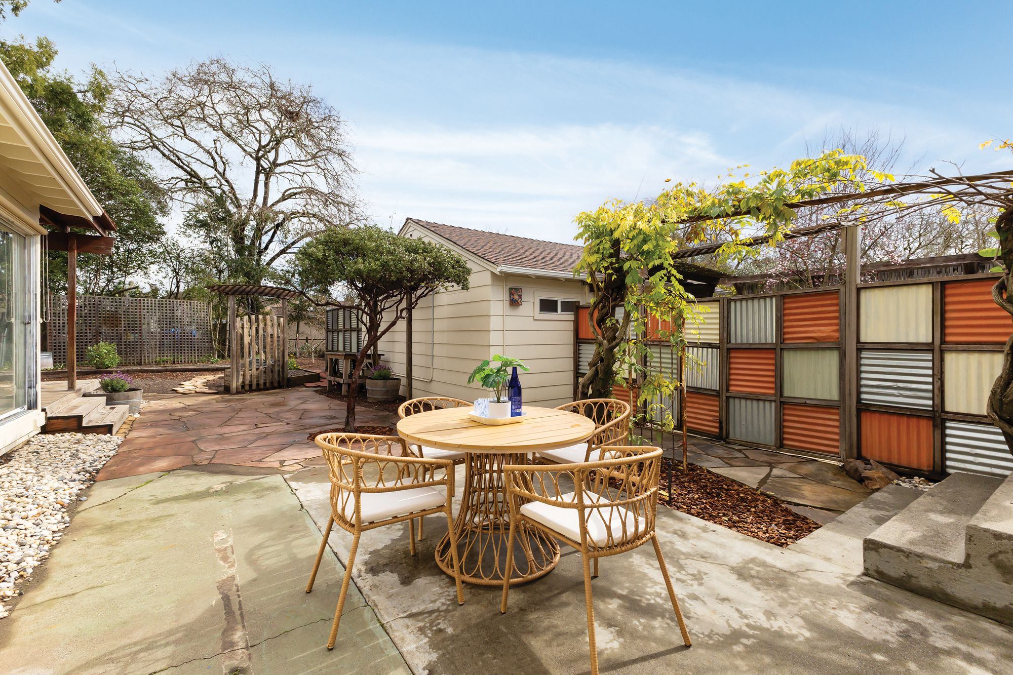 Welcome to the coveted J.C. neighborhood, where tree-lined streets, classic architecture, and a strong sense of community create one of Santa Rosa's most beloved settings. This charming single-story 3 bedroom, 2 bathroom home offers approximately 1,658+/- sqft of thoughtfully updated living space that blends timeless 1940s character with modern comfort. Inside, natural light fills the home, highlighting original hardwood floors, fresh interior paint, and inviting spaces designed for both everyday living and effortless entertaining. The updated kitchen features quartz countertops, a spacious pantry, and easy flow into the main living areas perfect for gathering with friends or enjoying quiet mornings at home. Owned solar enhances energy efficiency and long-term savings. The primary suite addition offers a peaceful retreat, complete with vaulted ceilings, skylights, a walk-in closet, and direct access to the expansive backyard. Whether hosting summer dinners, gardening, or simply unwinding outdoors, the generous yard provides endless possibilities for enjoying Sonoma County's indoor-outdoor lifestyle. Adding exceptional versatility, the detached permitted ADU (400+/- sqft) has its own address, private gated entrance, and fenced yard. Ideal for guests, extended family, creative workspace, or income potential, it includes a full kitchen, full bath, walk-in closet, separate washer and dryer hookups, and efficient heating and cooling. Located just moments from downtown Santa Rosa, neighborhood parks, local dining, and shopping, this special property offers the rare combination of historic charm, modern flexibility, and an unbeatable location in one of the city's most desirable neighborhoods.